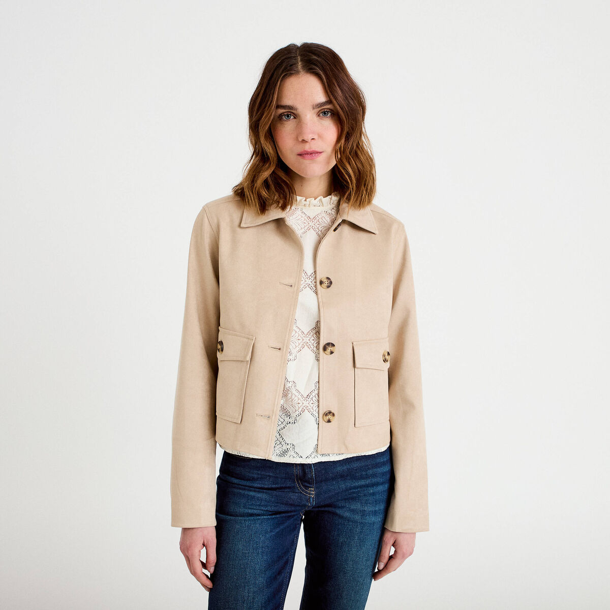 80% OFFDANS LE PANIERVeste droite cropped aspect daim beige femme
