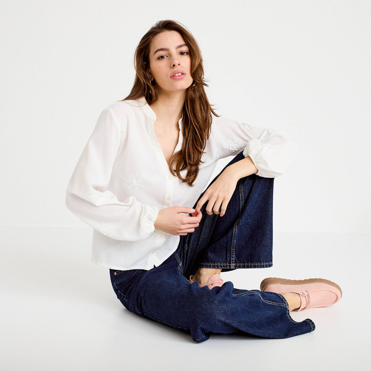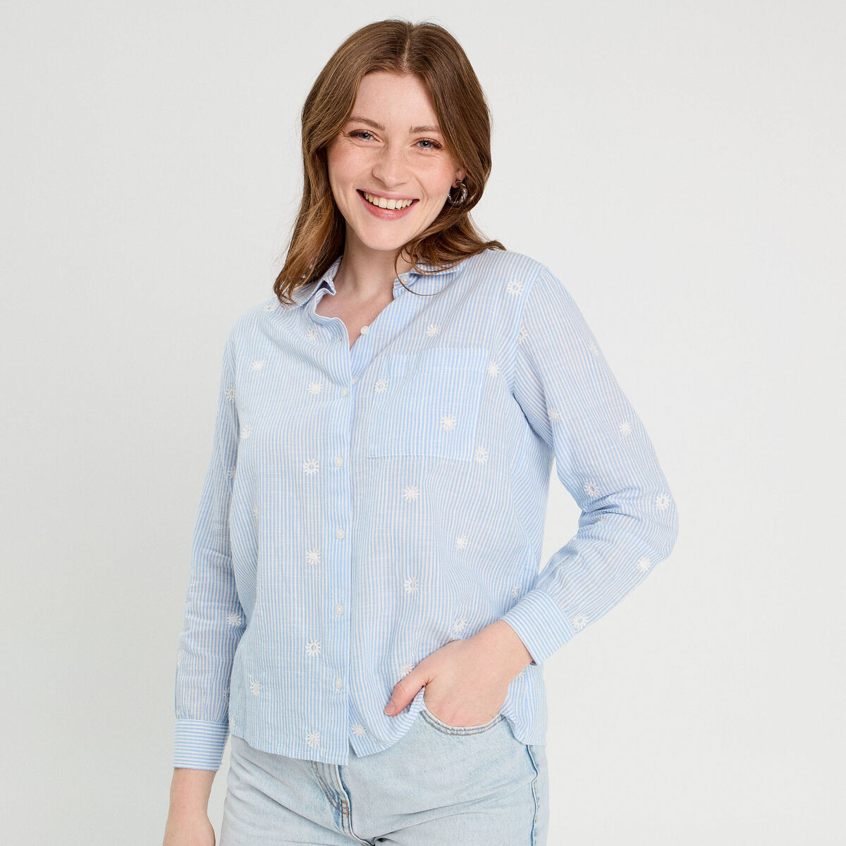 Chemise brodée manches longues blanc femme