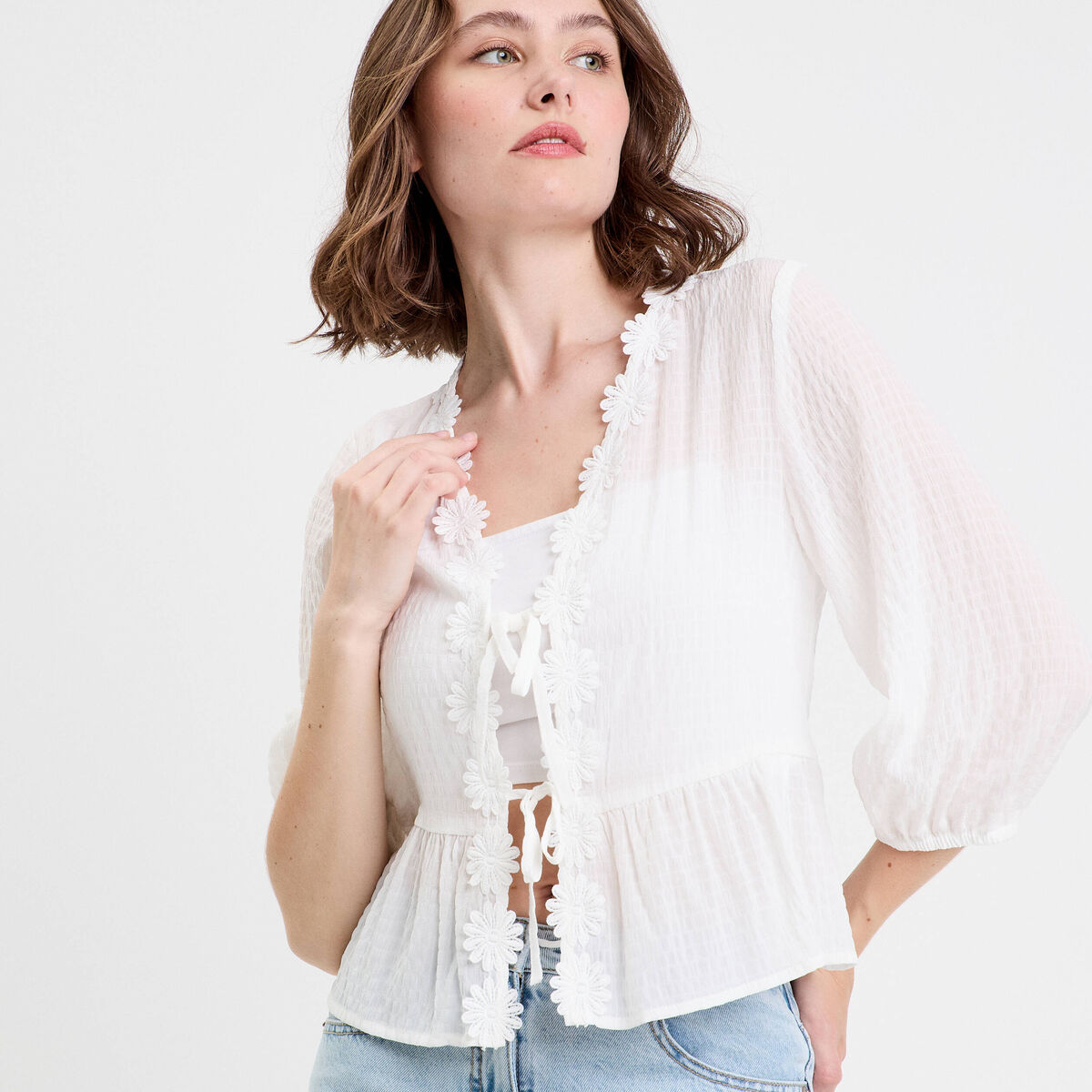 Blouse ajourée manches longues ivoire femme