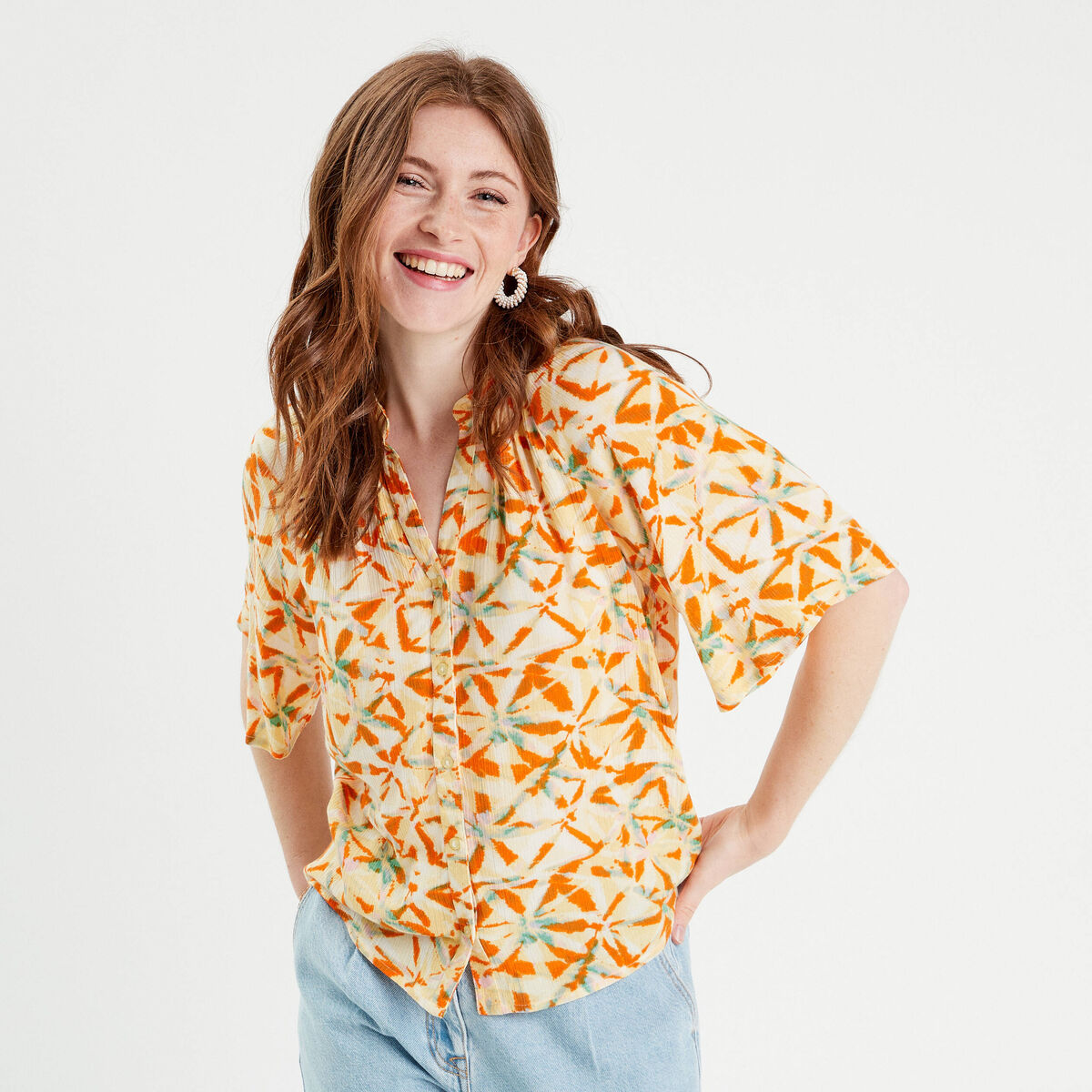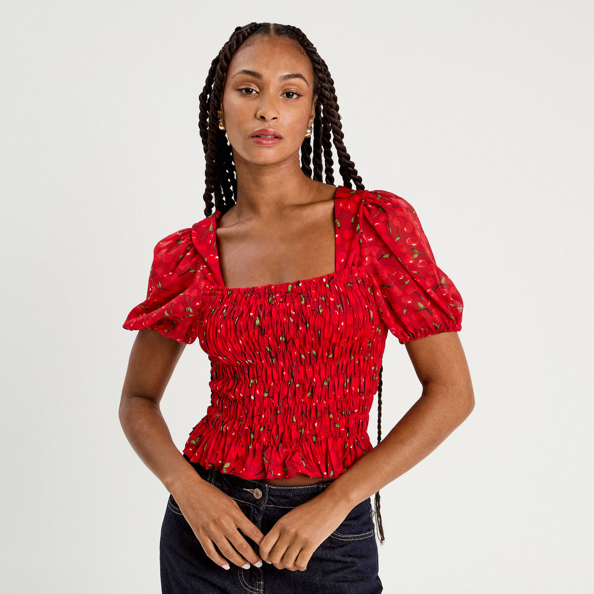 Blouse manches courtes smockée blanc femme
