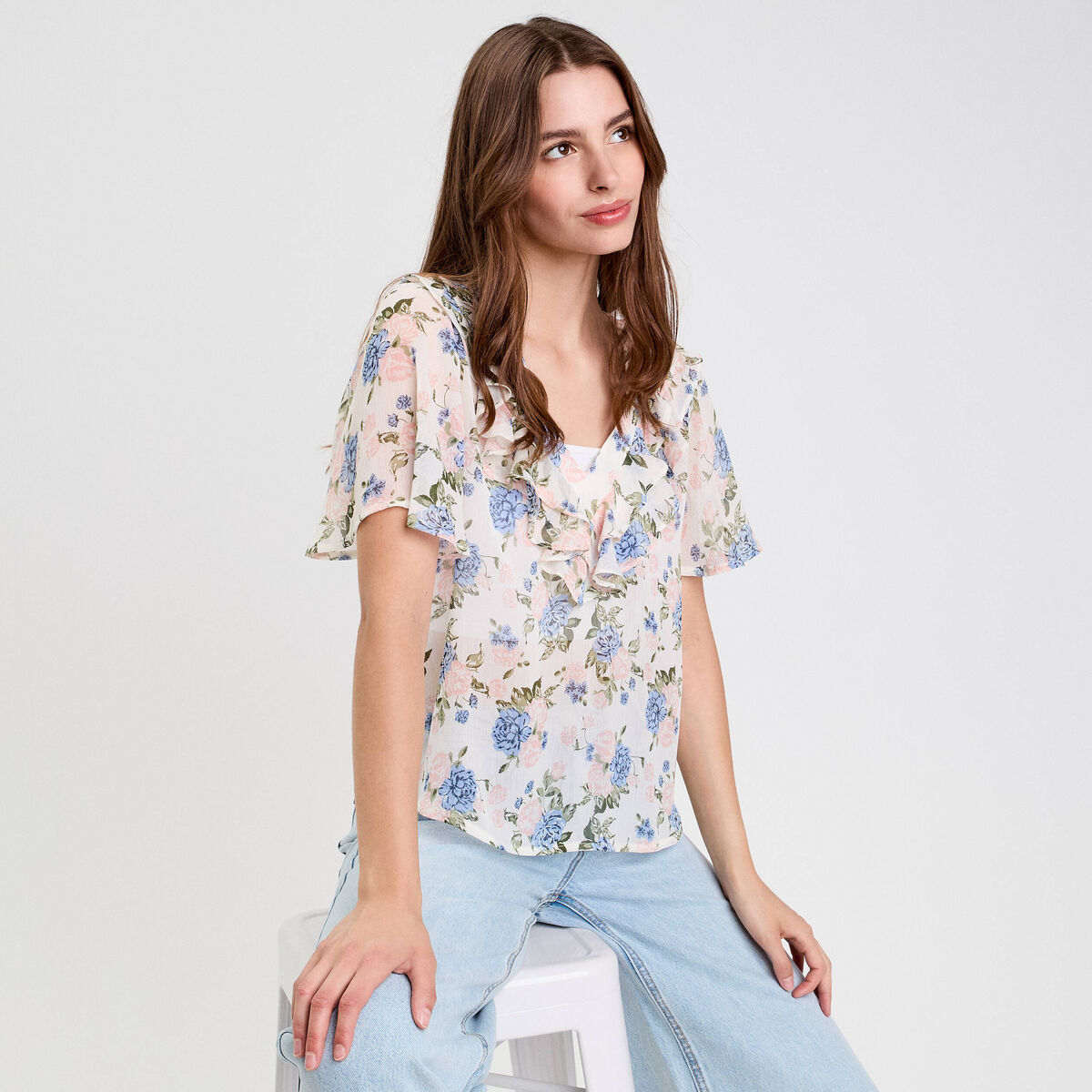 Blouse brodée col V ecru femme