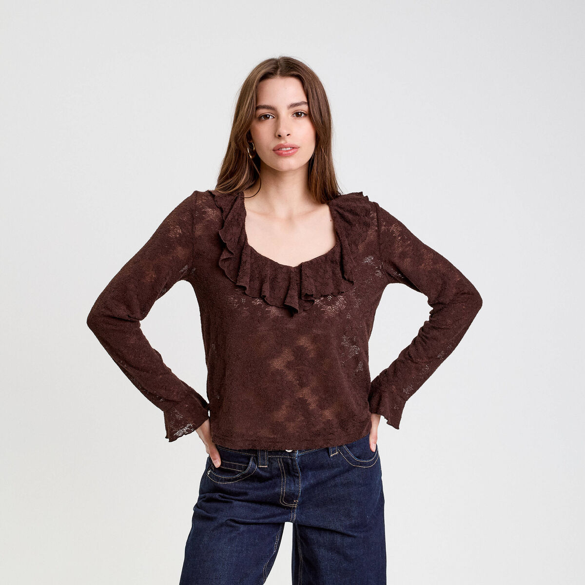 Blouse ajourée manches longues marron foncé femme