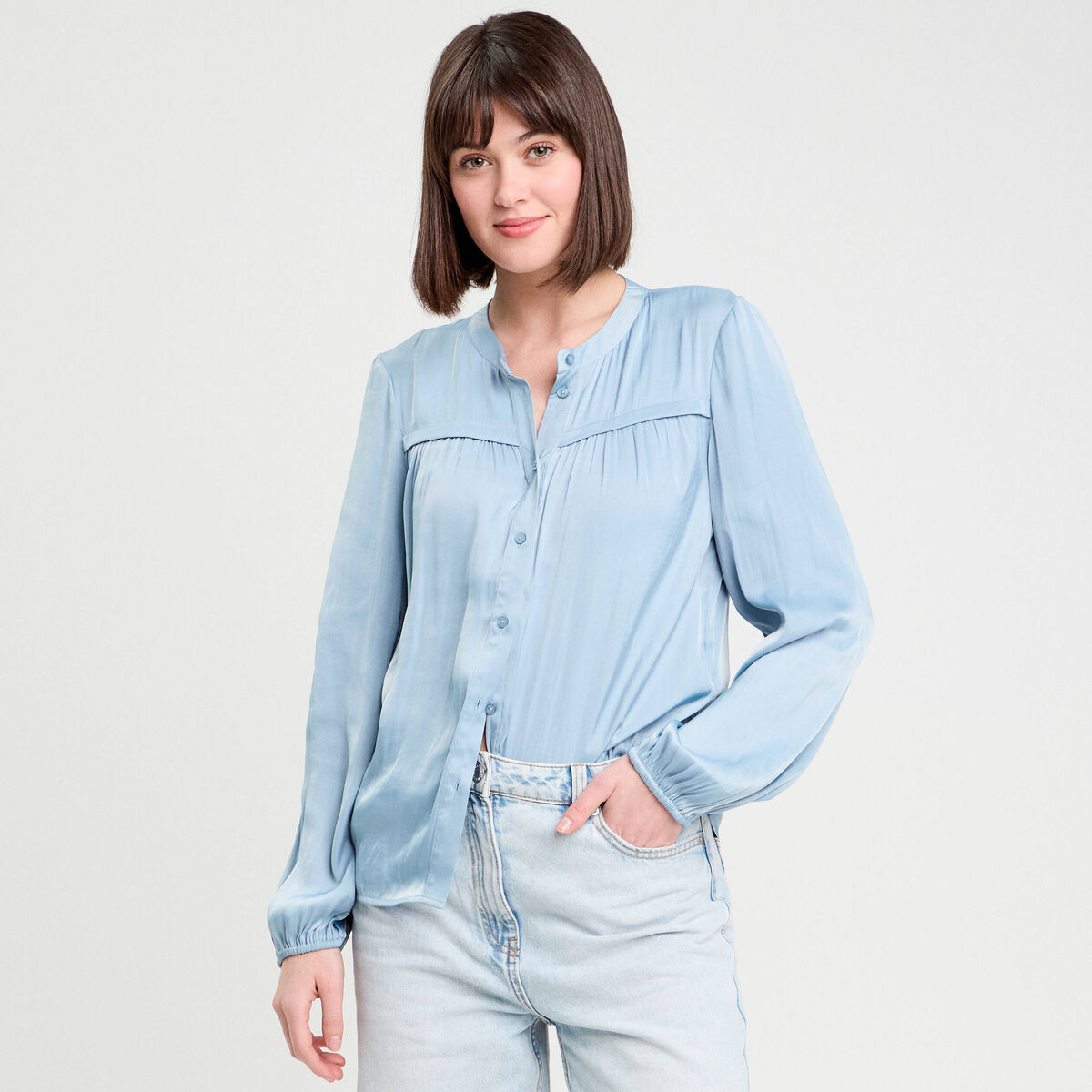 Blouse manches longues satin bleu clair femme
