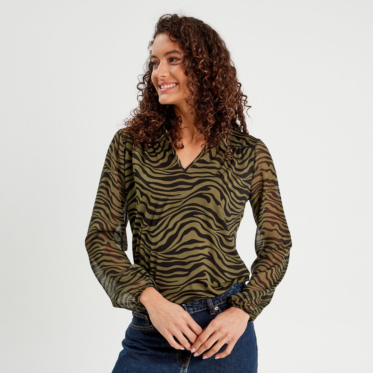 Blouse broderie col V manches longues vert kaki femme