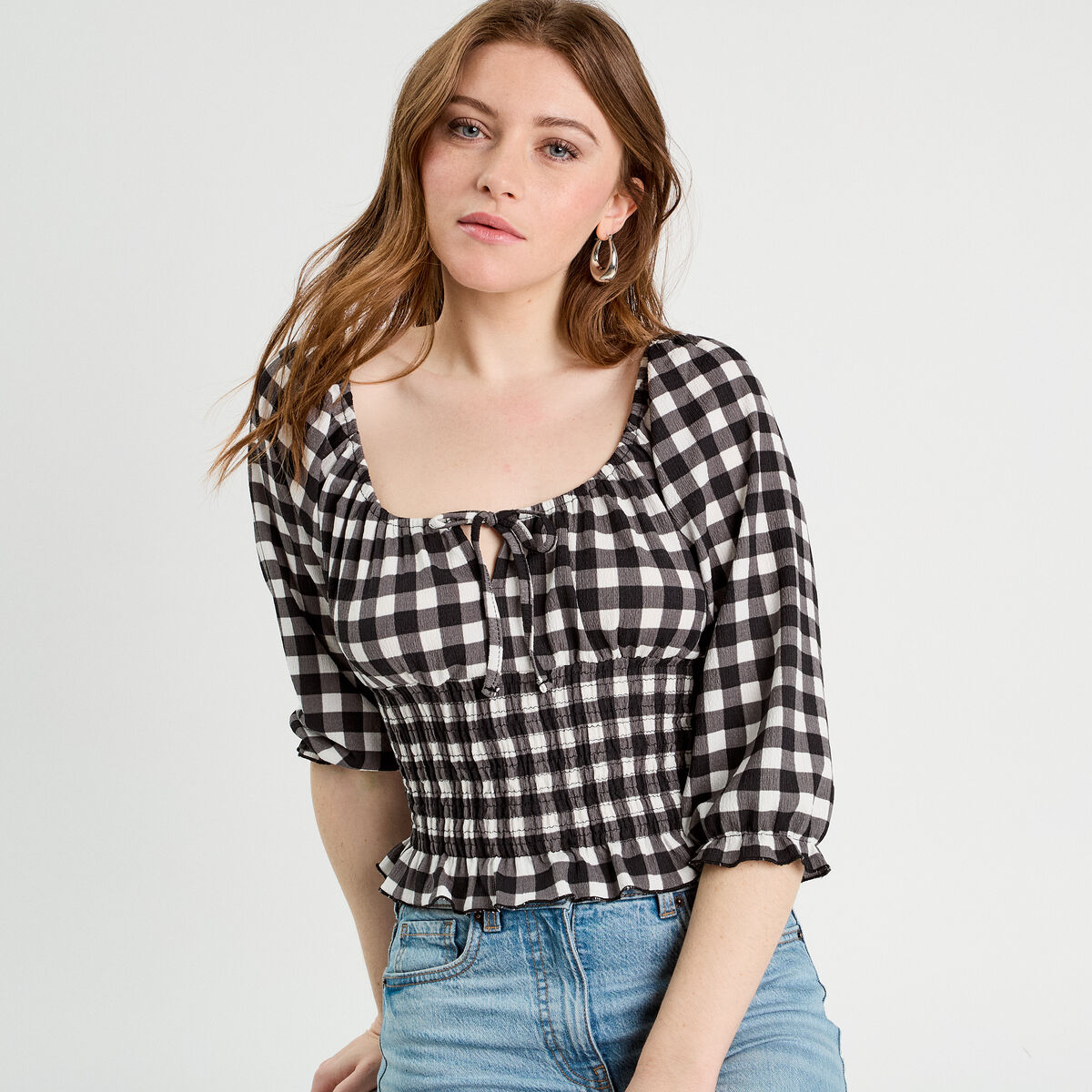 Blouse smockée manches 3/4 blanc femme