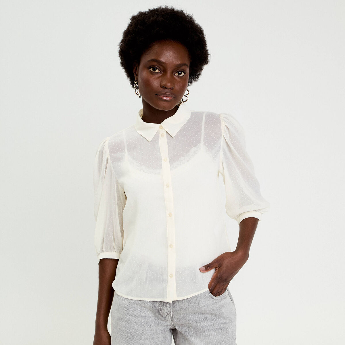 Chemise droite courte voile manches 3/4 ecru femme