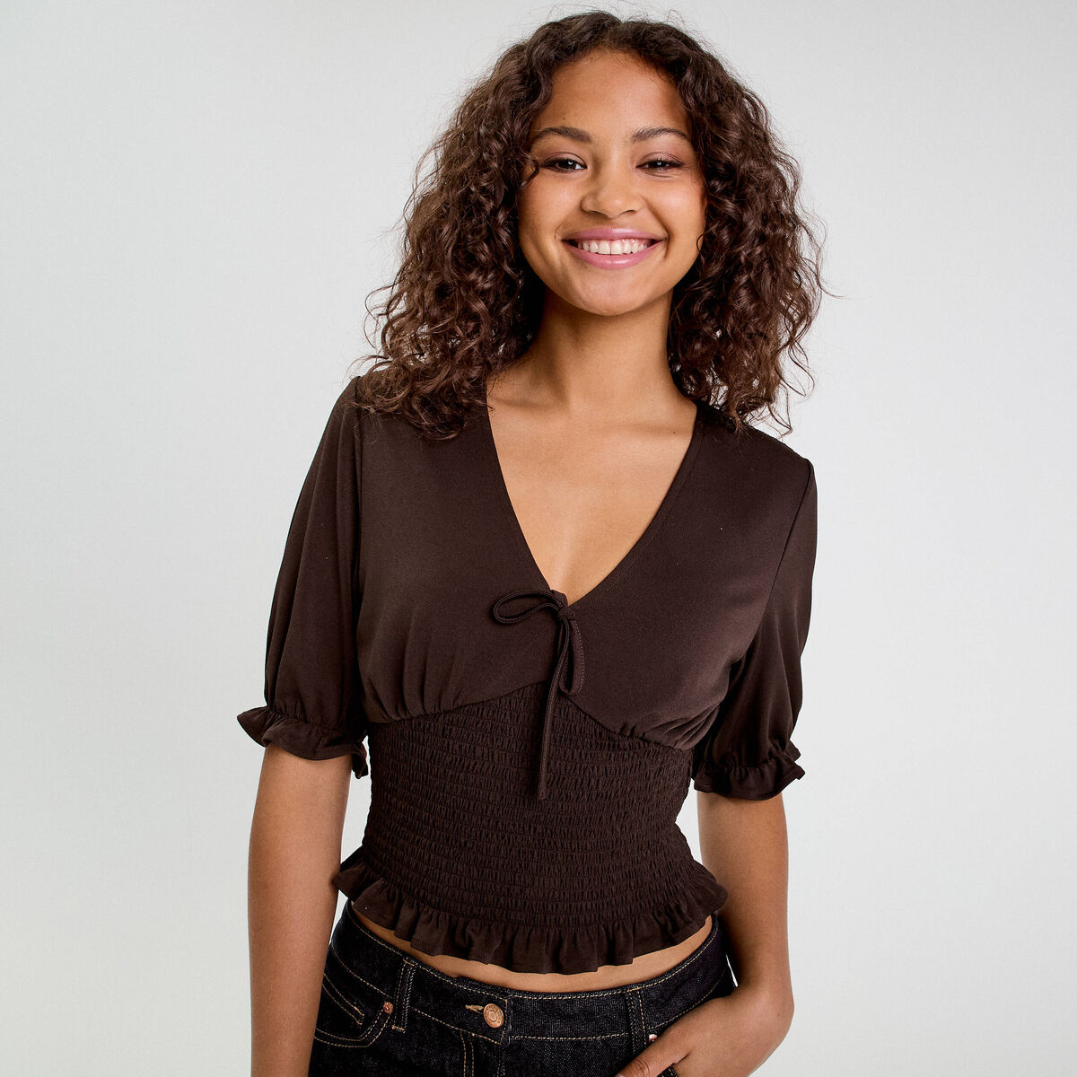 Blouse manches courtes smockée marron foncé femme