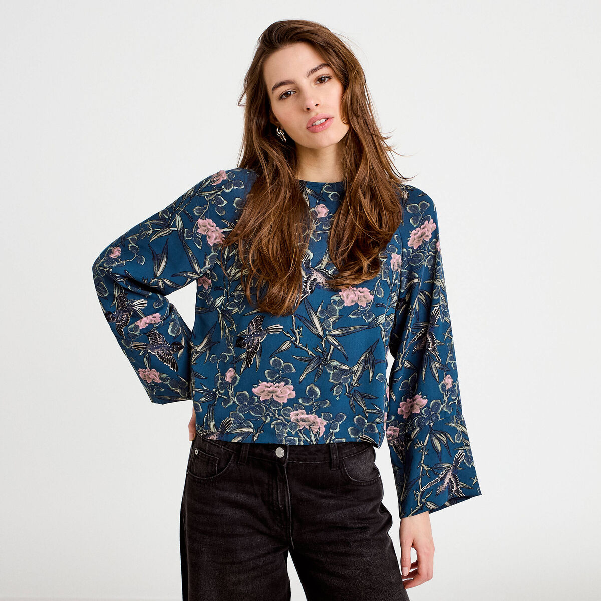 Blouse manches longues encolure bateau bleu pétrole femme