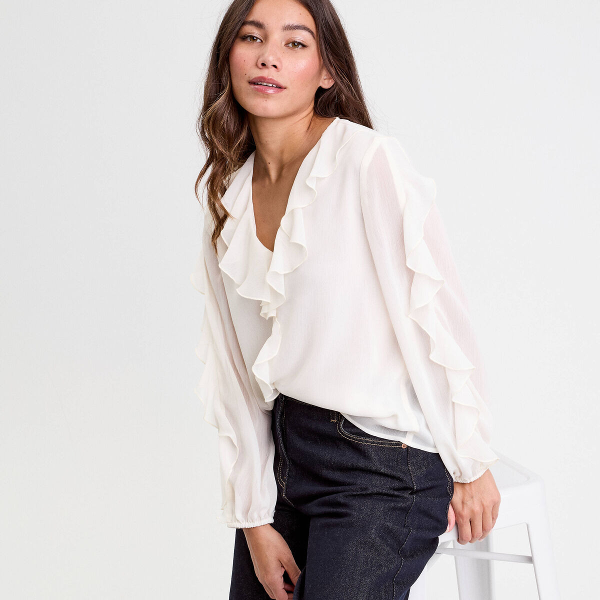 Blouse col V manches longues ecru femme