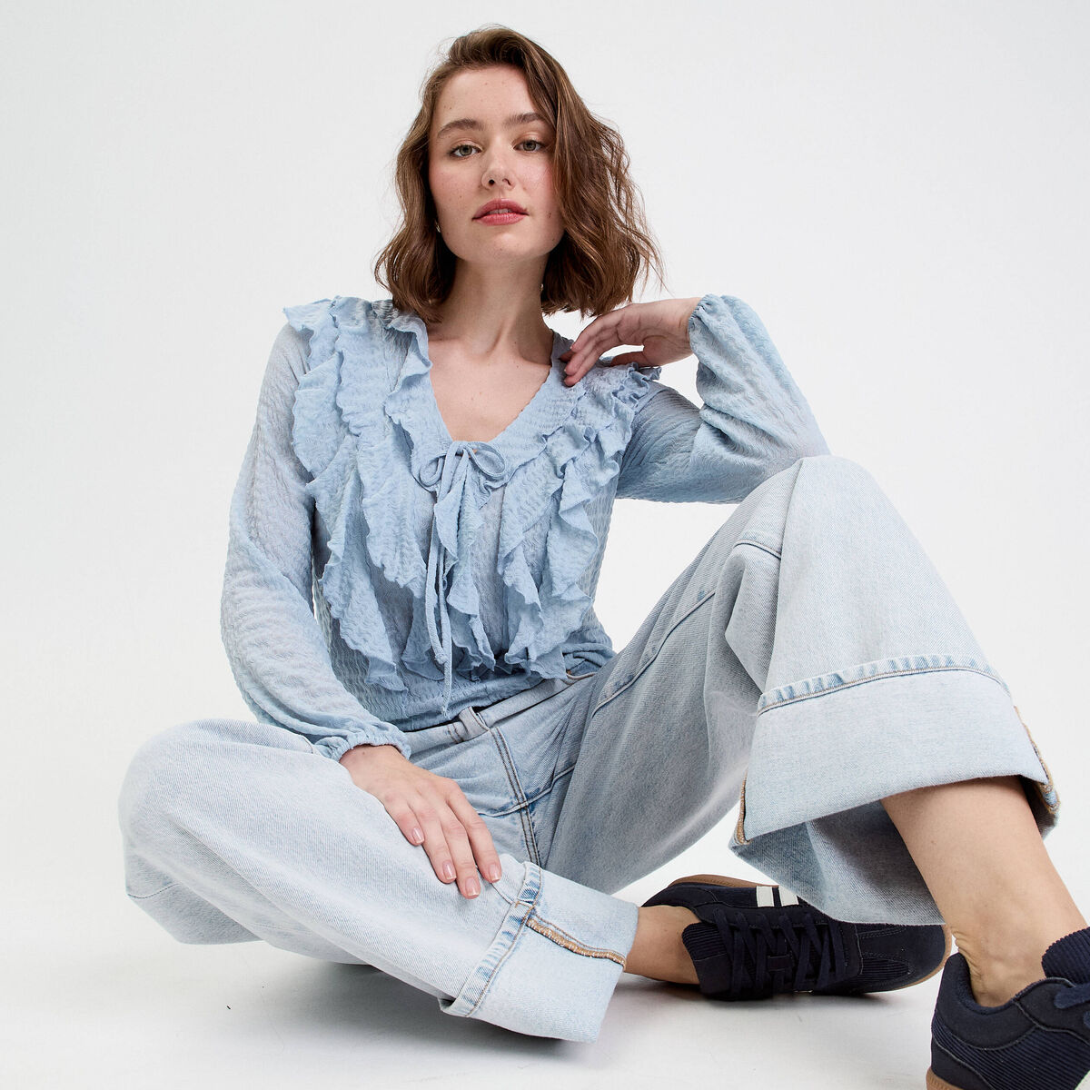 Blouse nouée manches longues bleu pastel femme