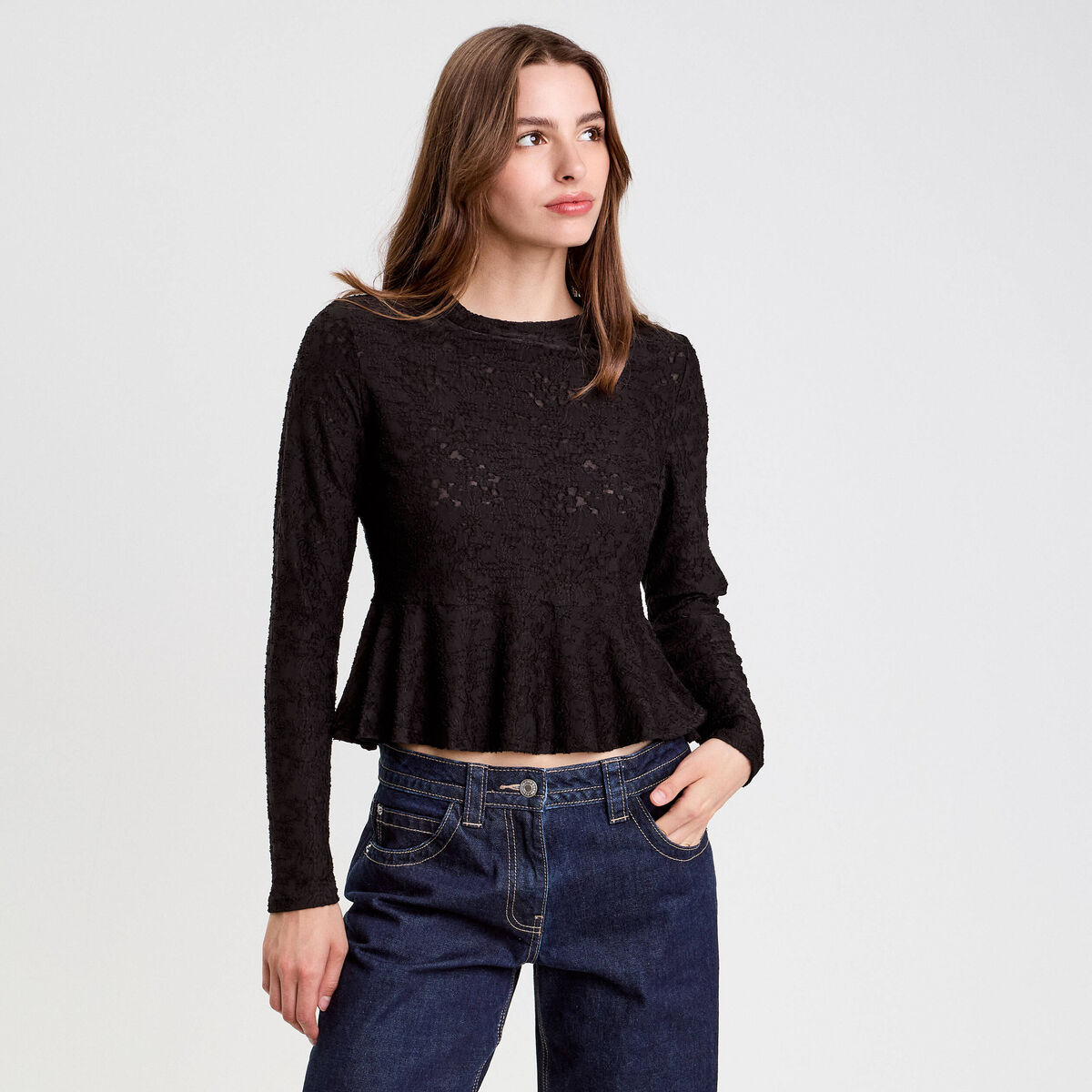 Blouse ajustée col rond manches longues noir femme