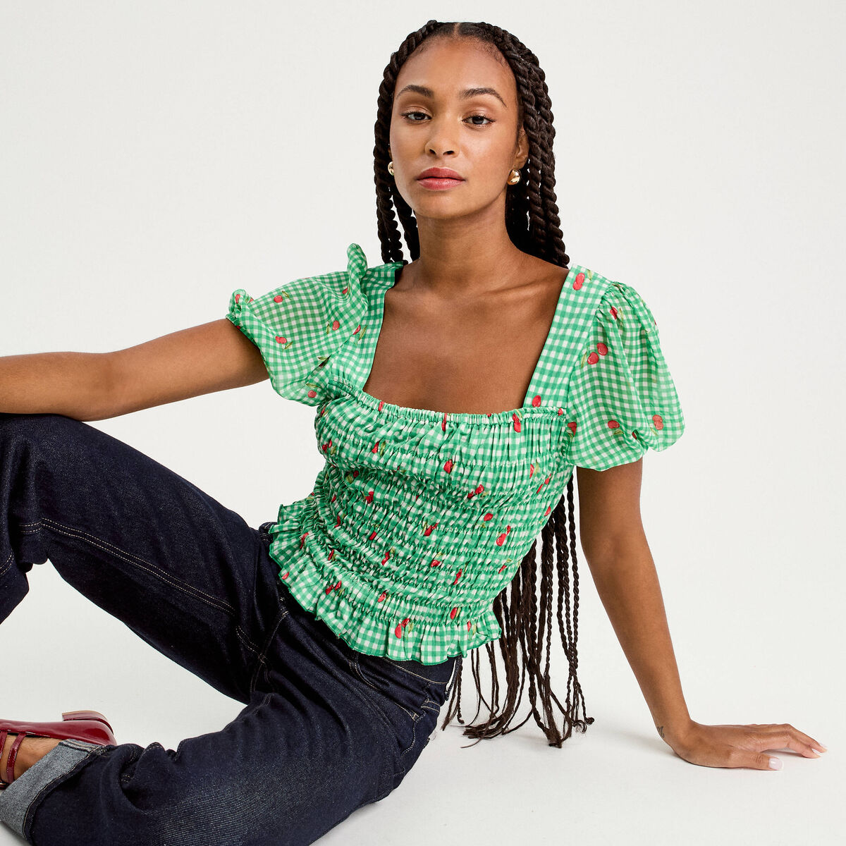 Blouse manches courtes smockée rouge femme