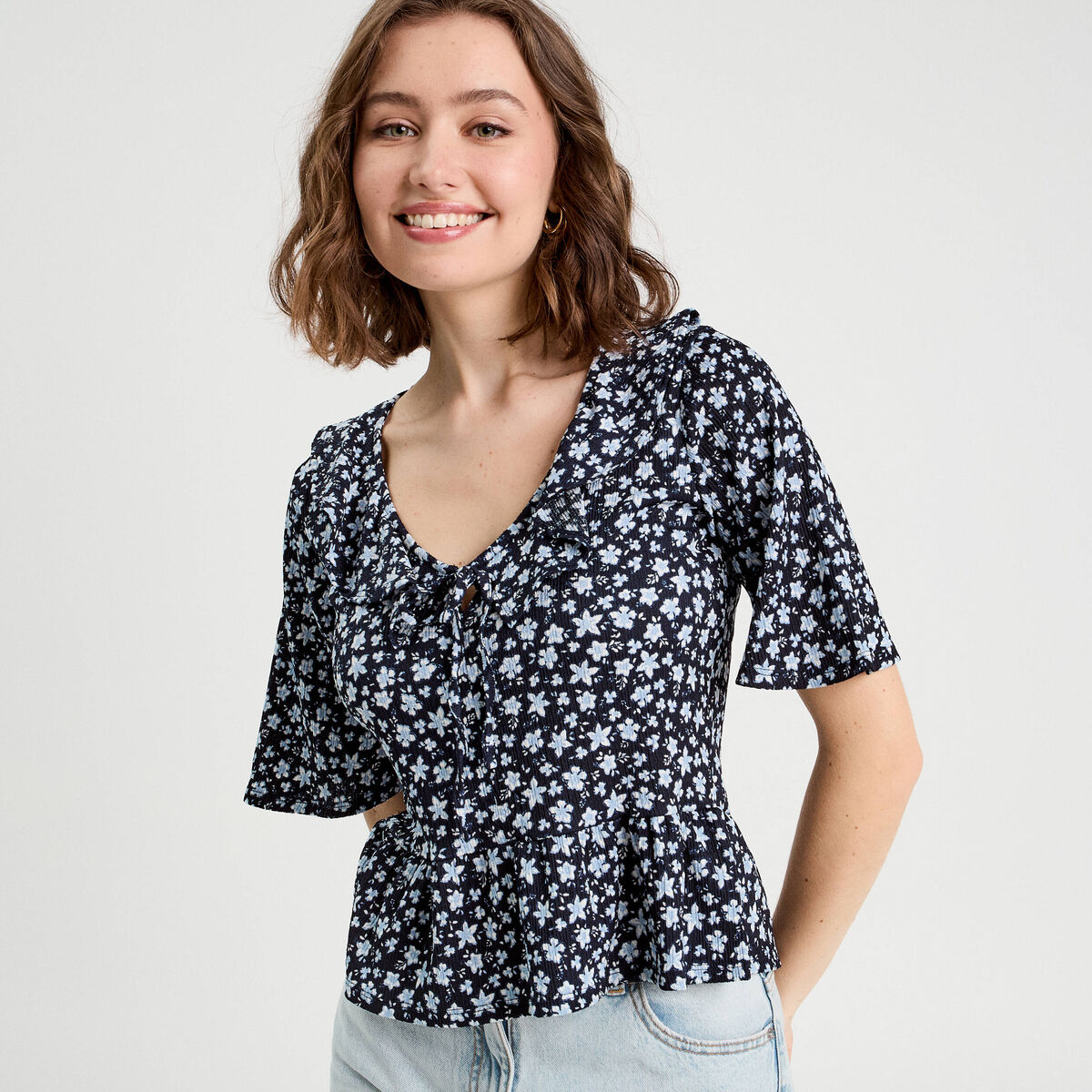 Blouse noeud et volants noir femme