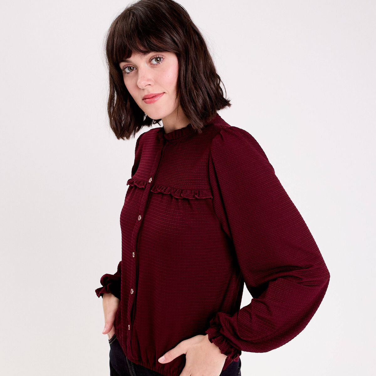 Blouse détails volants violet foncé femme