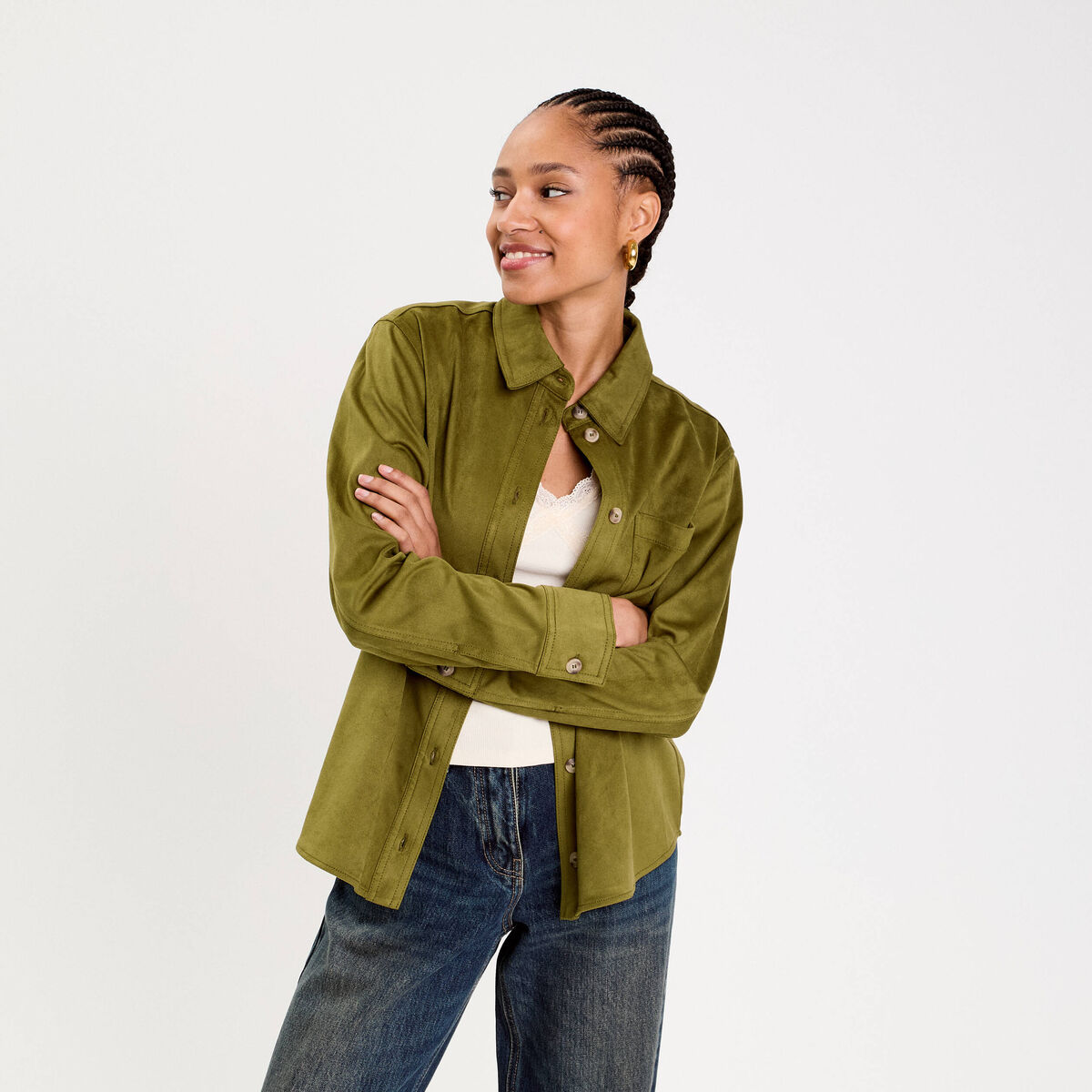 Chemise aspect daim vert olive femme