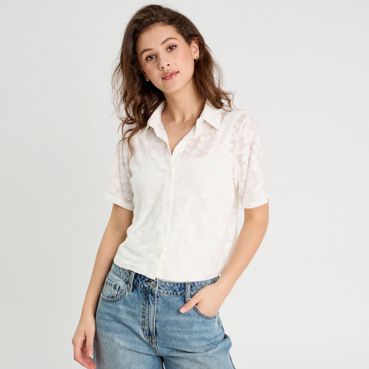 Blouse ajourée manches courtes ecru femme