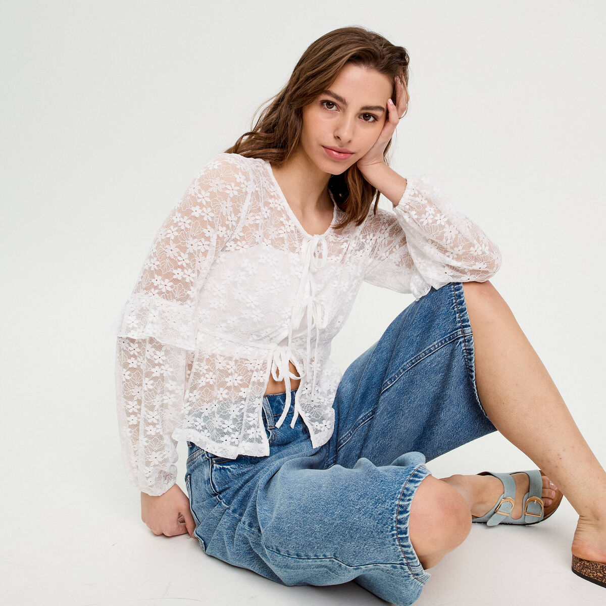 Blouse manches longues noeuds blanc femme