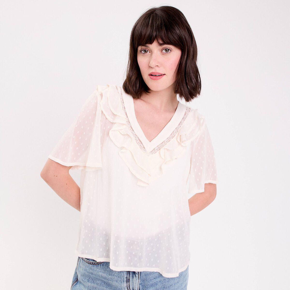 Blouse ajourée col v manches longues ecru femme