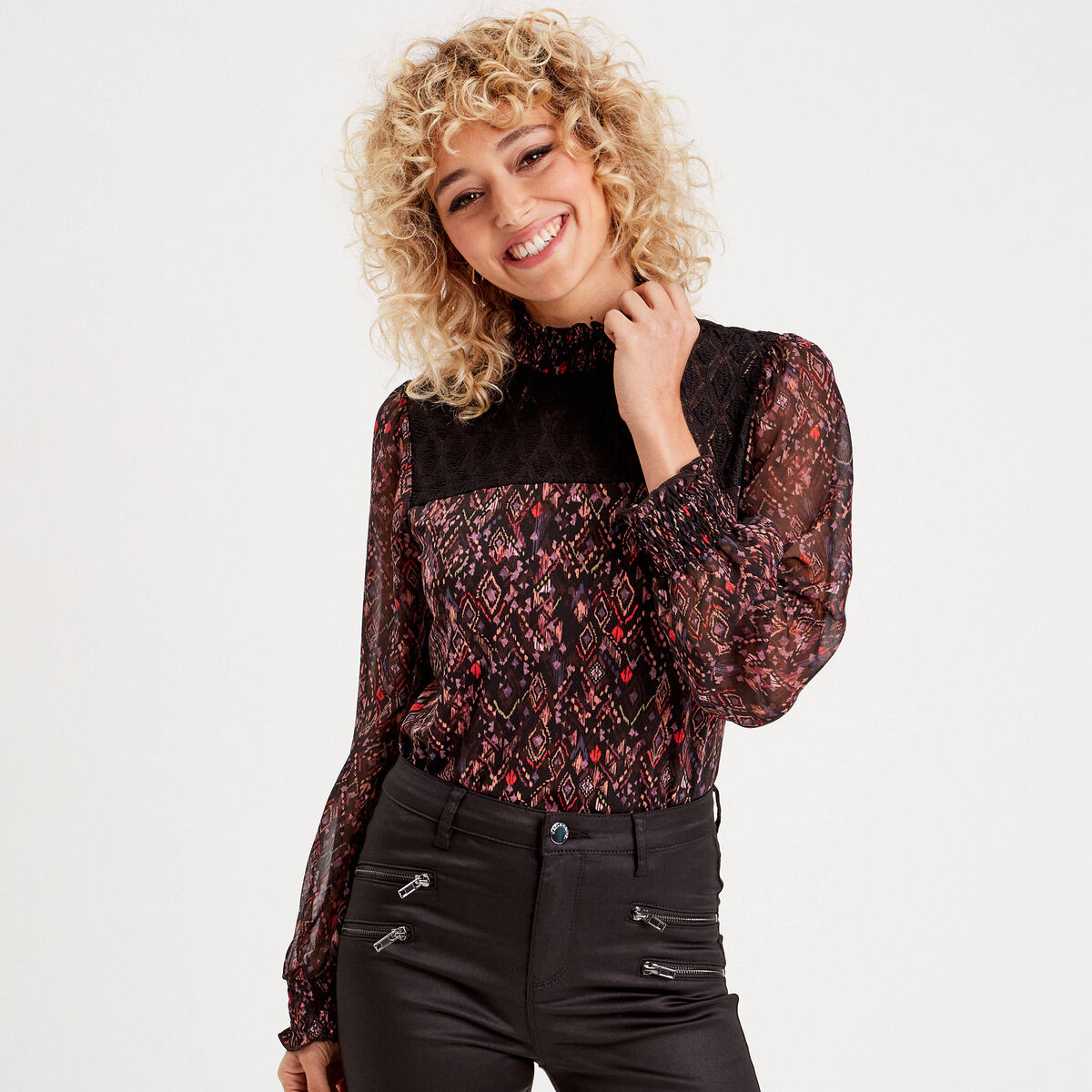 Blouse col montant smocké noir femme