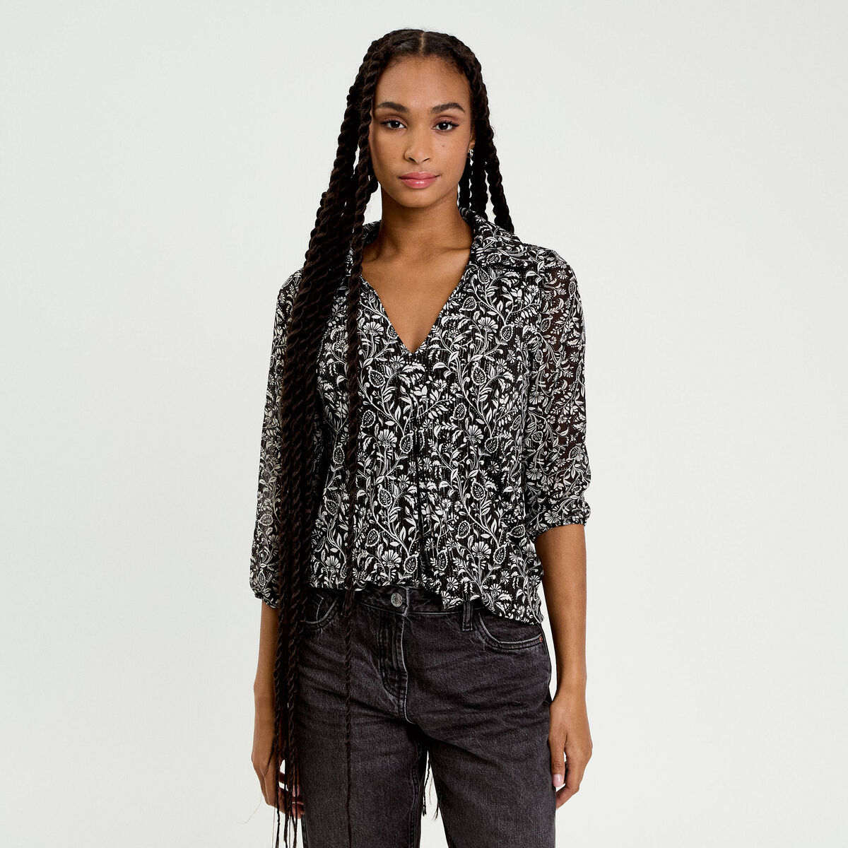Blouse col v manches longues en voile noir femme