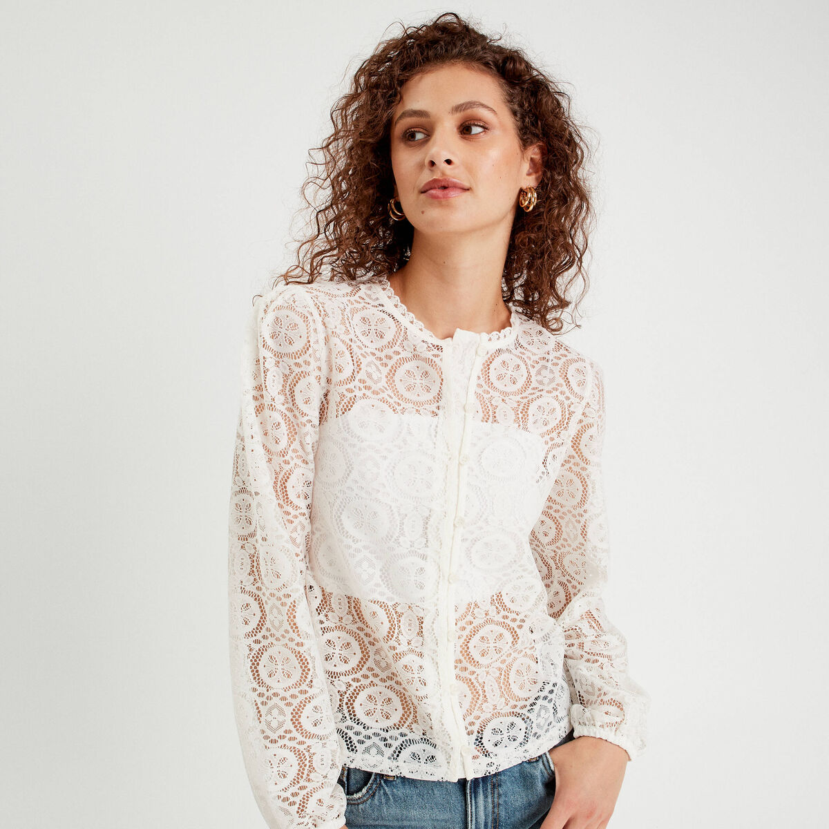 Blouse dentelle col montant ecru femme