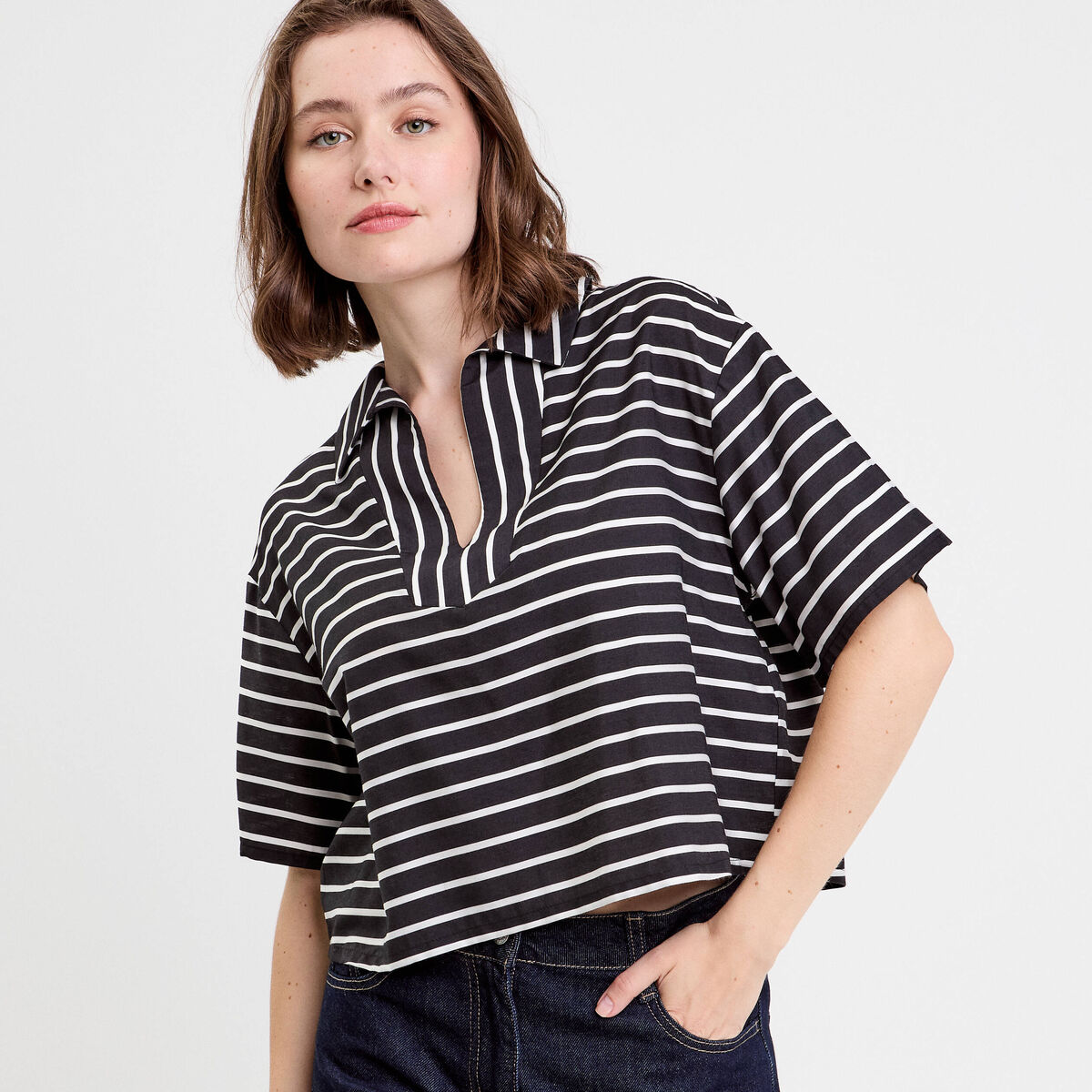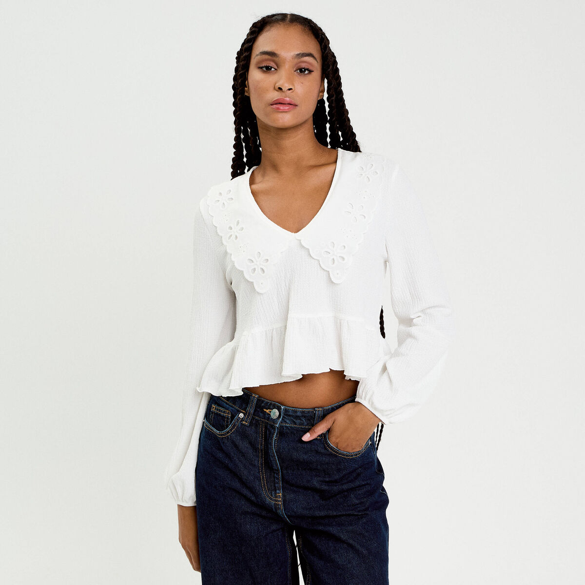 Blouse cropped grand col brodé ecru femme