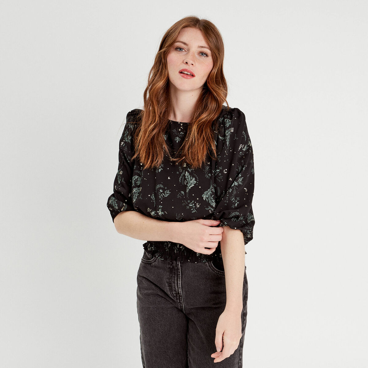 Blouse smockée manches courtes noir femme
