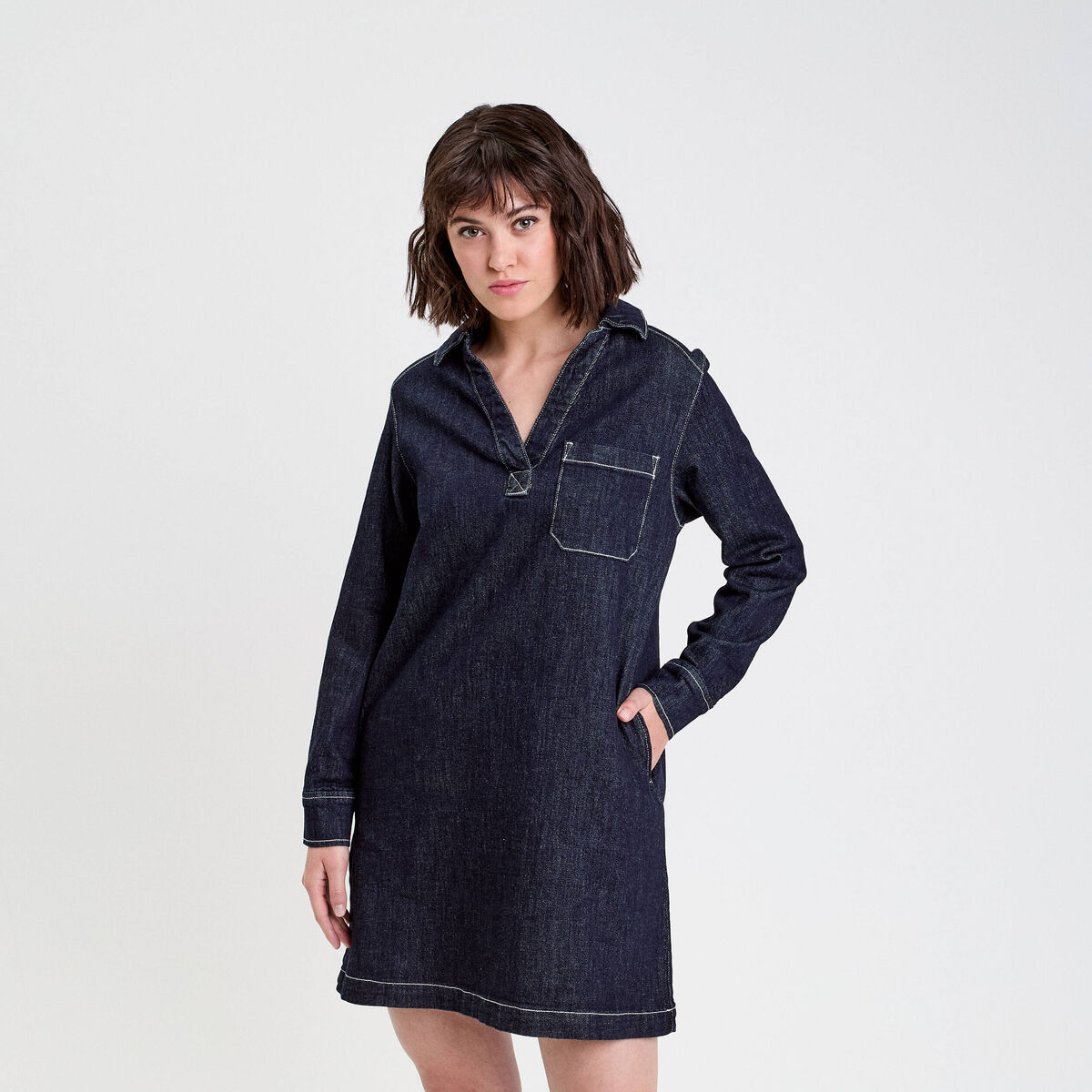 Robe droite courte col v en jean denim brut femme