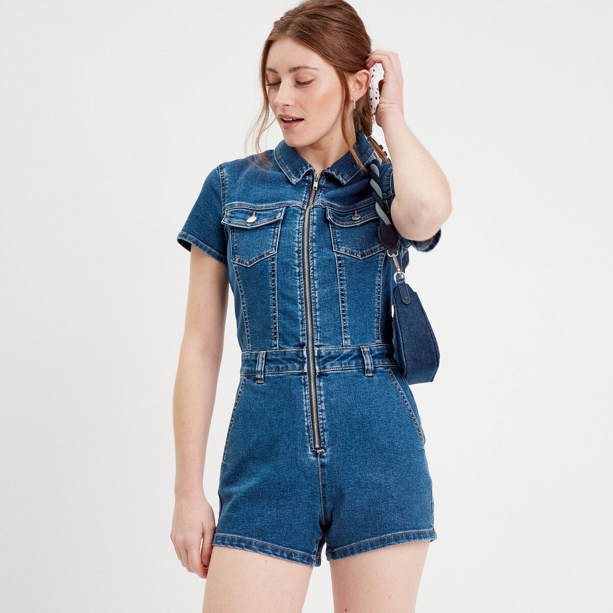 Combishort zippée en jean denim double stone femme