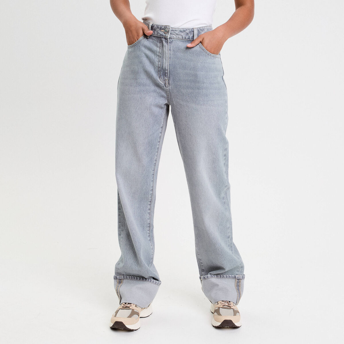 Jeans droit à revers denim gris femme