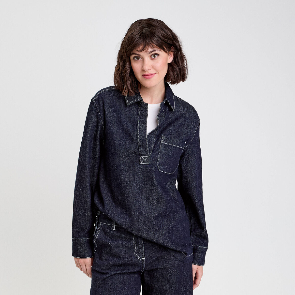 Blouse col chemise manches longues denim brut femme
