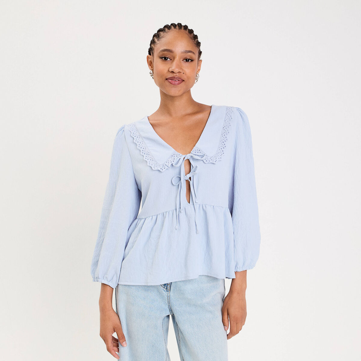 Blouse nouée en jean denim bleach femme