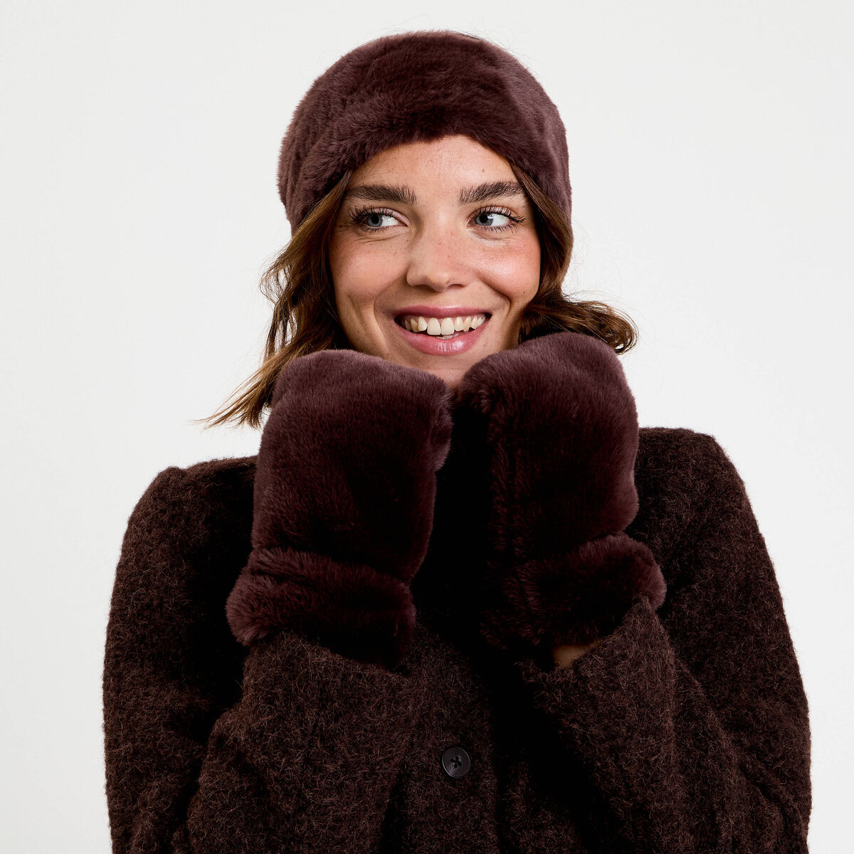 Set bandeau et gants fausse fourrure marron foncé femme