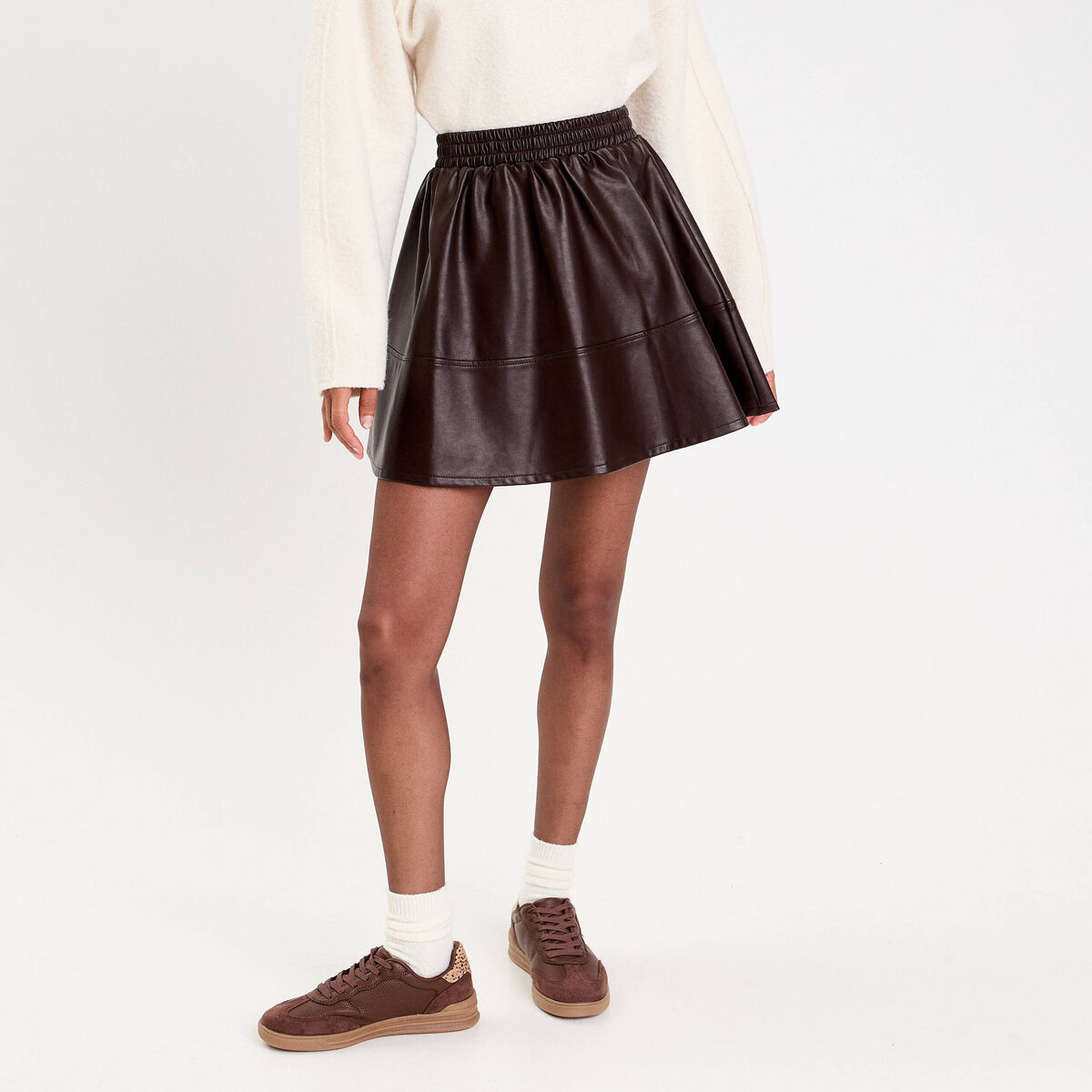 Jupe patineuse en similicuir marron foncé femme