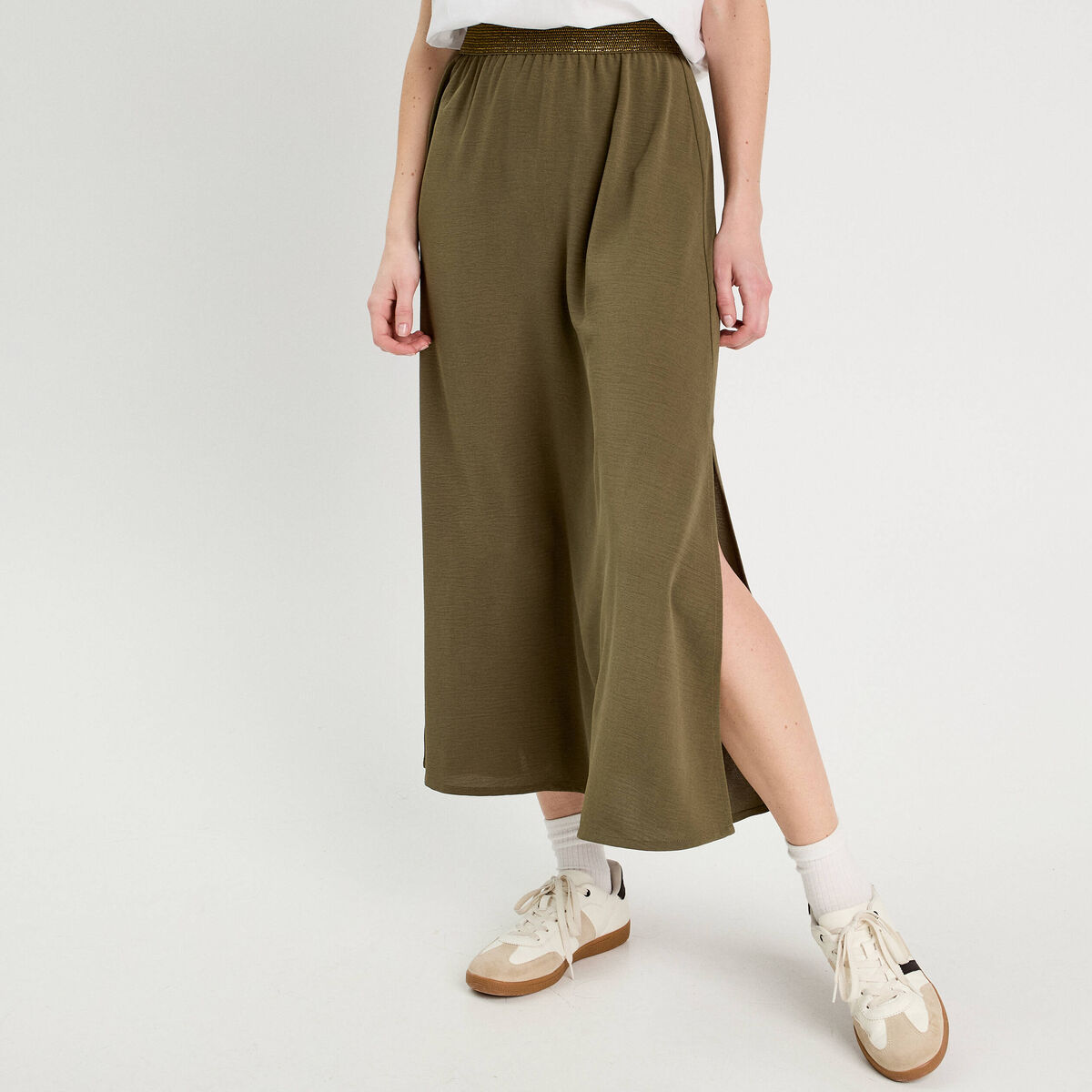 Jupe longue évasée fluide vert kaki femme