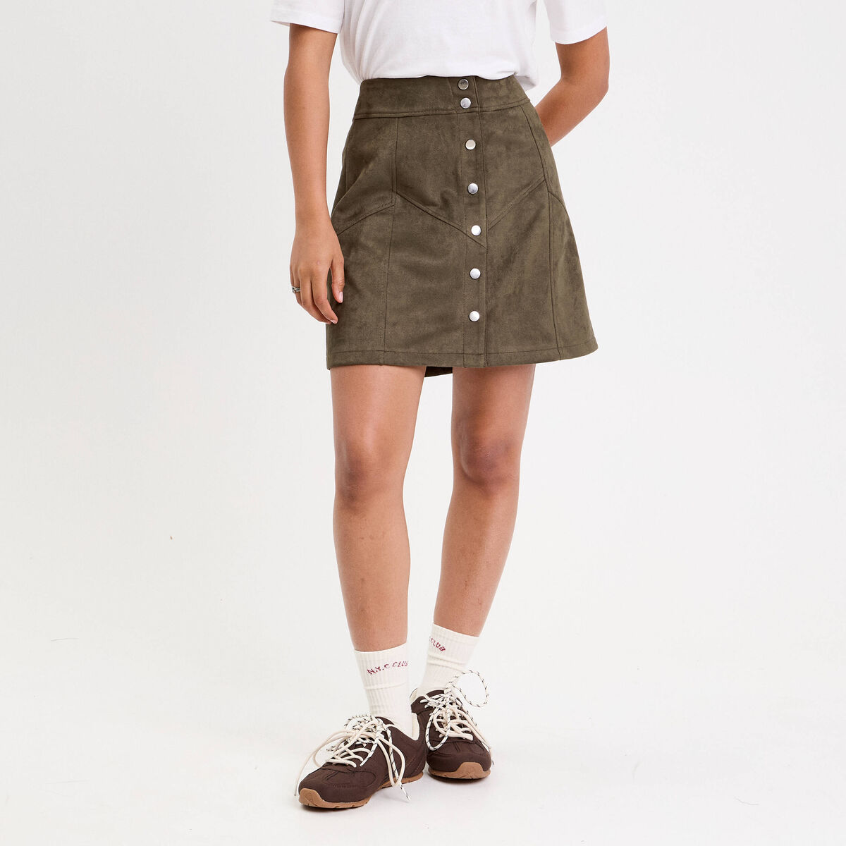 Jupe trapèze courte aspect daim vert kaki femme