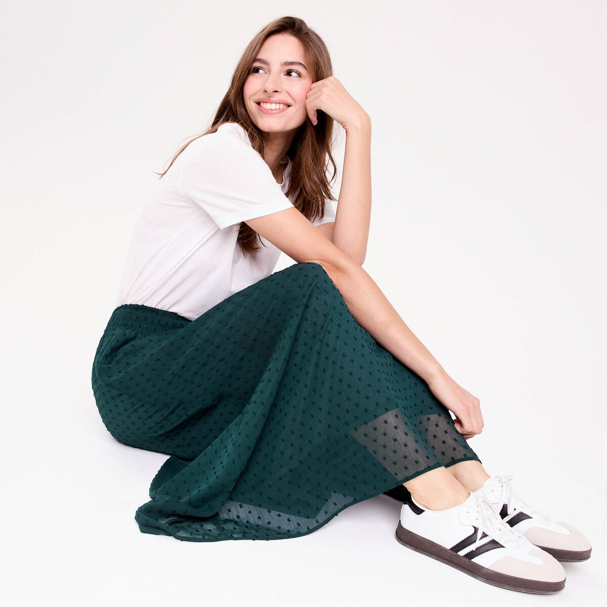 Jupe longue à plumetis vert foncé femme