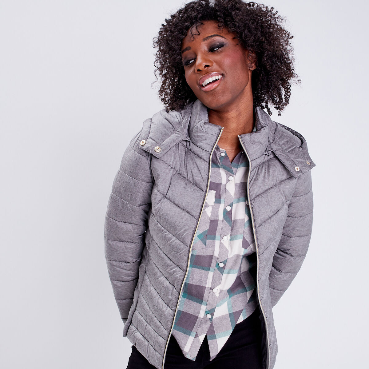 Doudoune droite à capuche gris clair femme