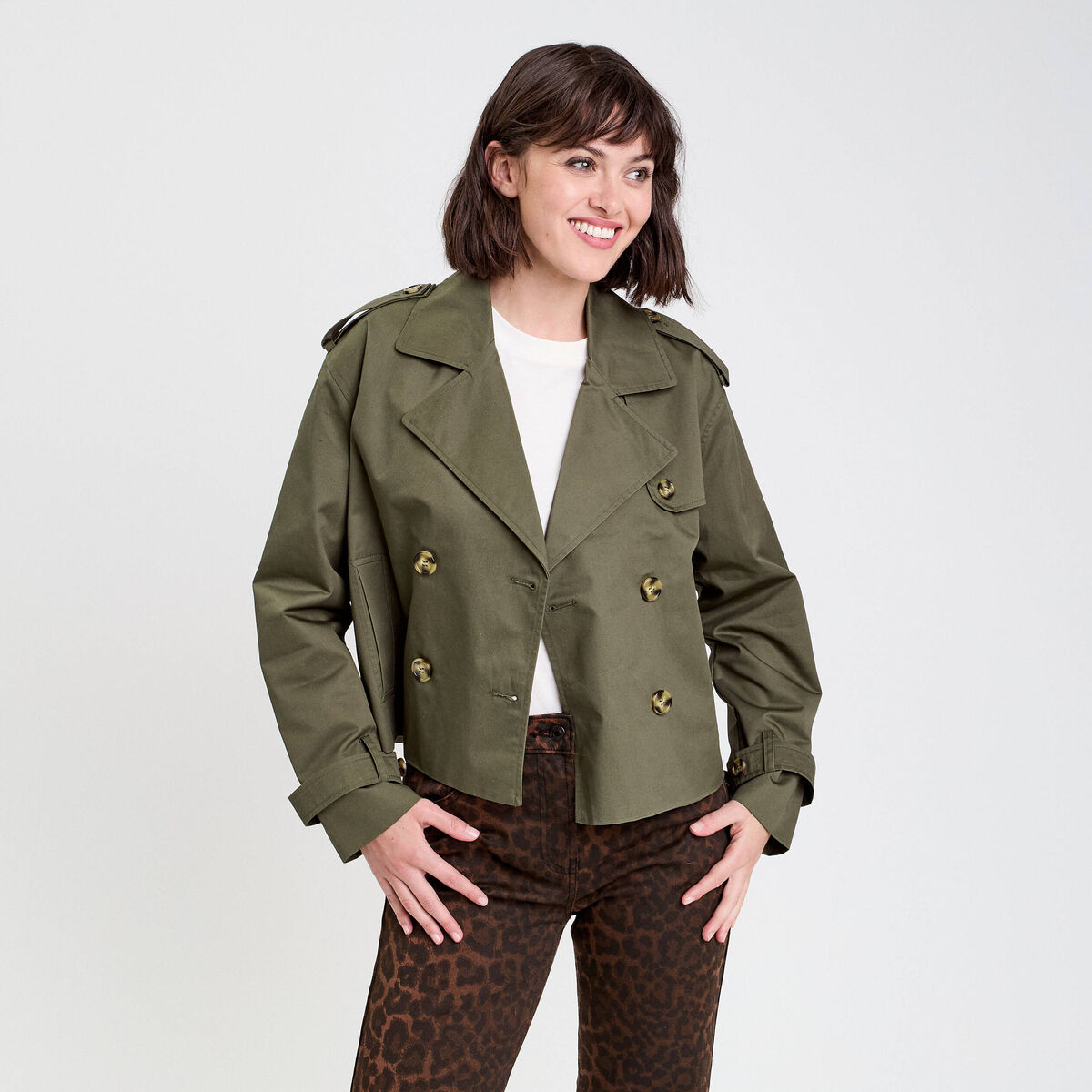 Trench court boutonné vert kaki femme