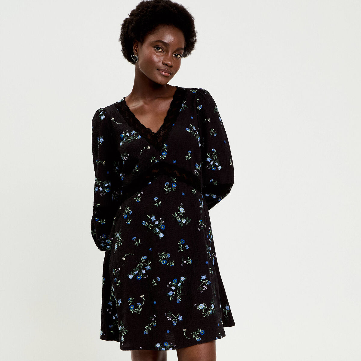 Robe évasée col v manches longues noir femme