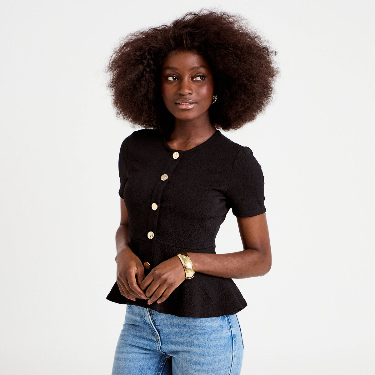Top cintré col rond manches courtes noir femme