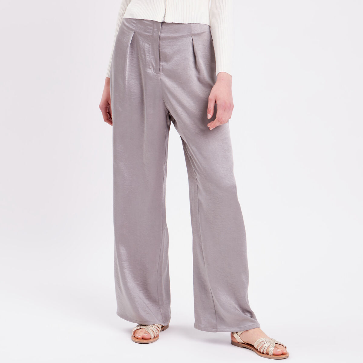 Pantalon large fluide satiné gris argent femme