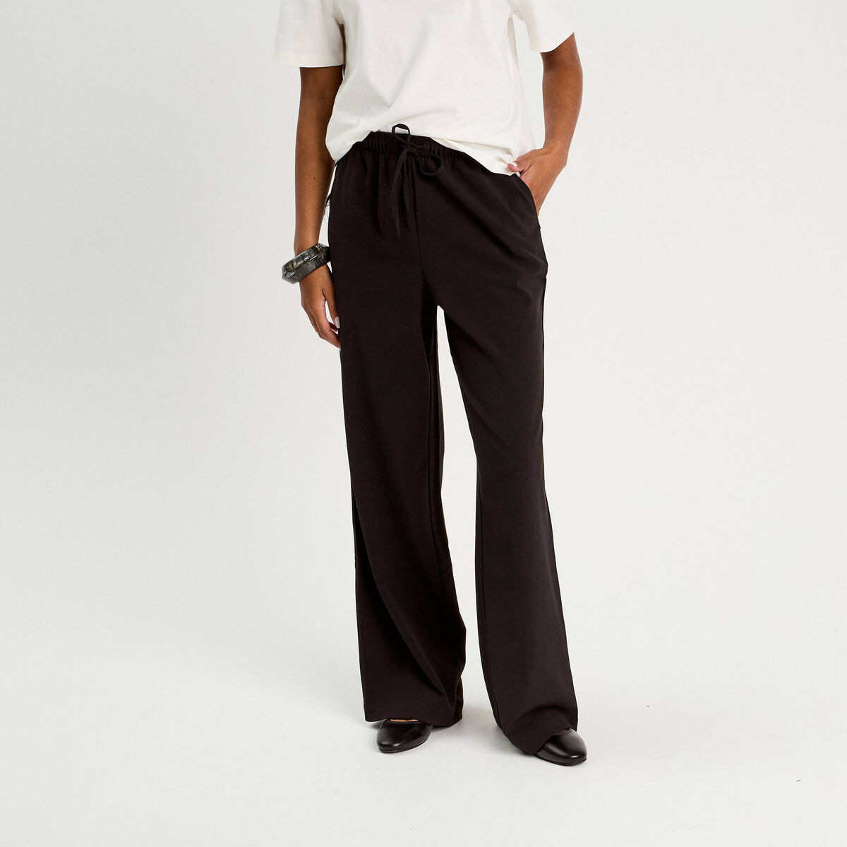 Pantalon large fluide ceinturé noir femme