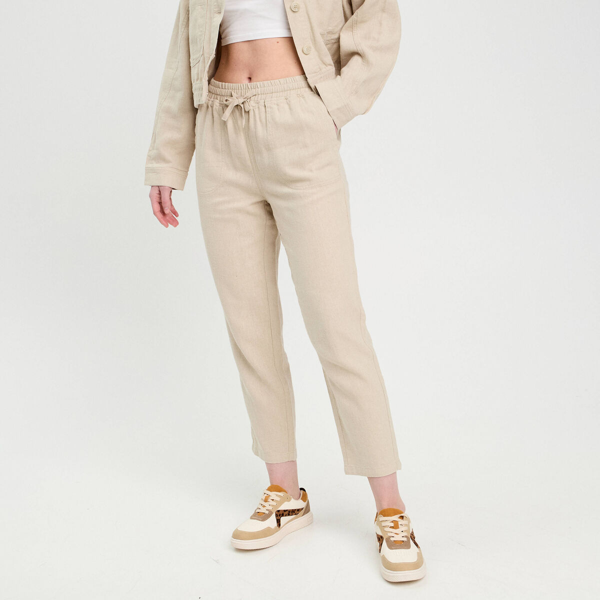 Pantalon carotte contenant du lin beige femme