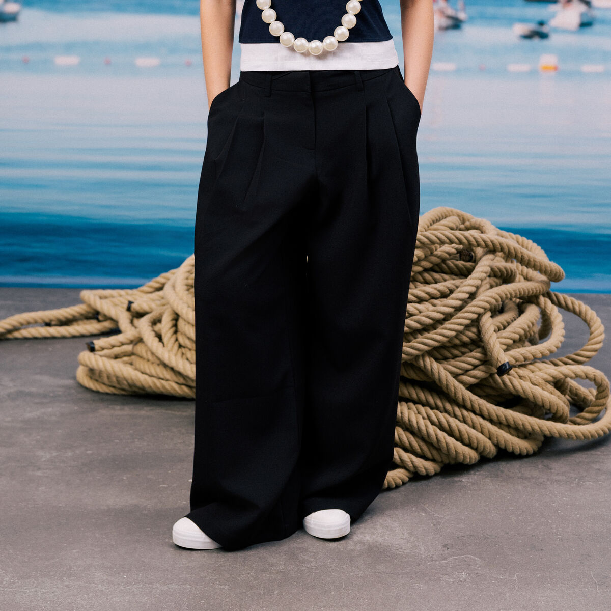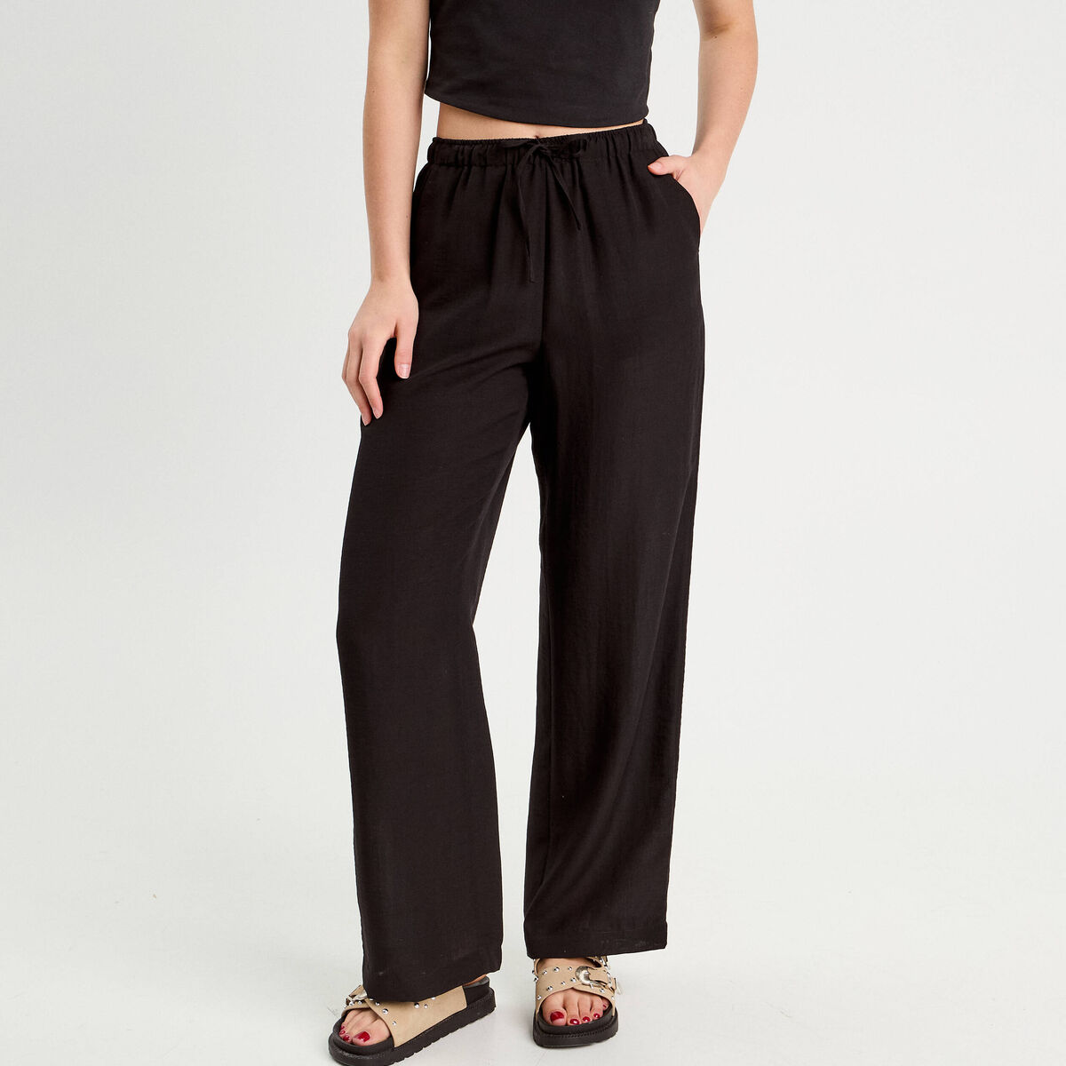 Pantalon large taille haute fluide noir femme