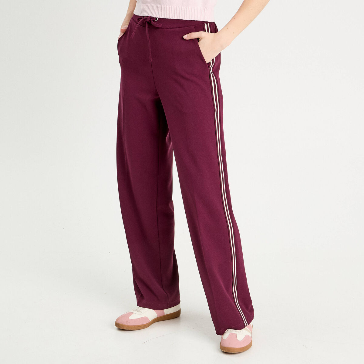 Pantalon large avec bandes prune femme