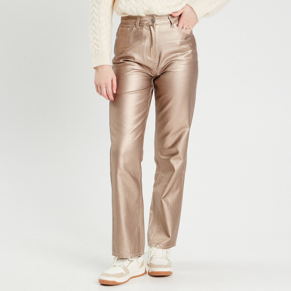 Pantalon droit enduit couleur or femme