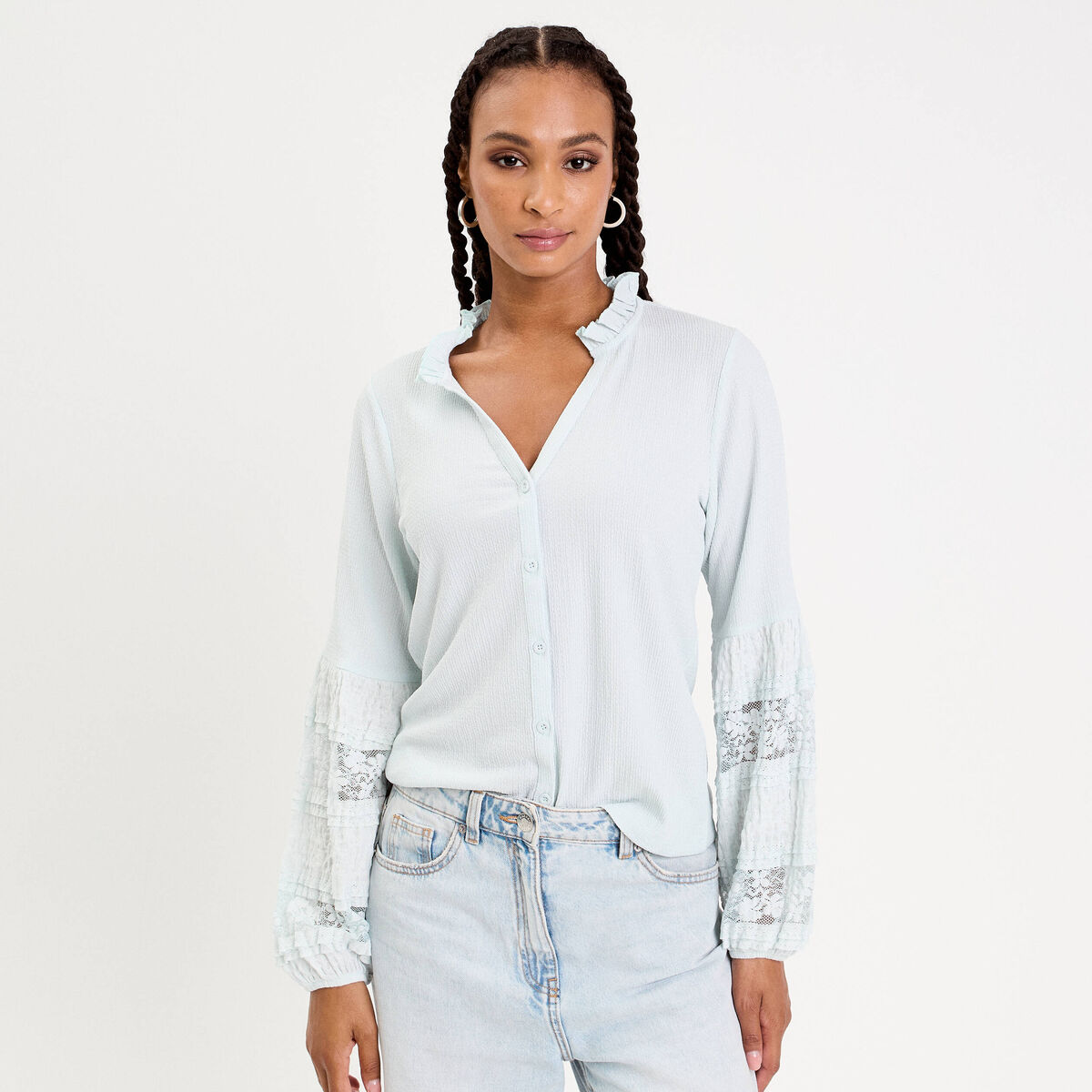 Blouse col V manches longues bleu ciel femme