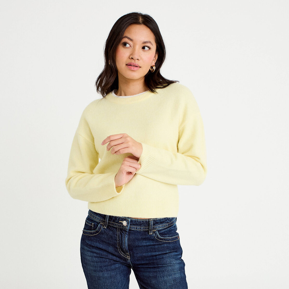 Pull col rond manches longues jaune clair femme