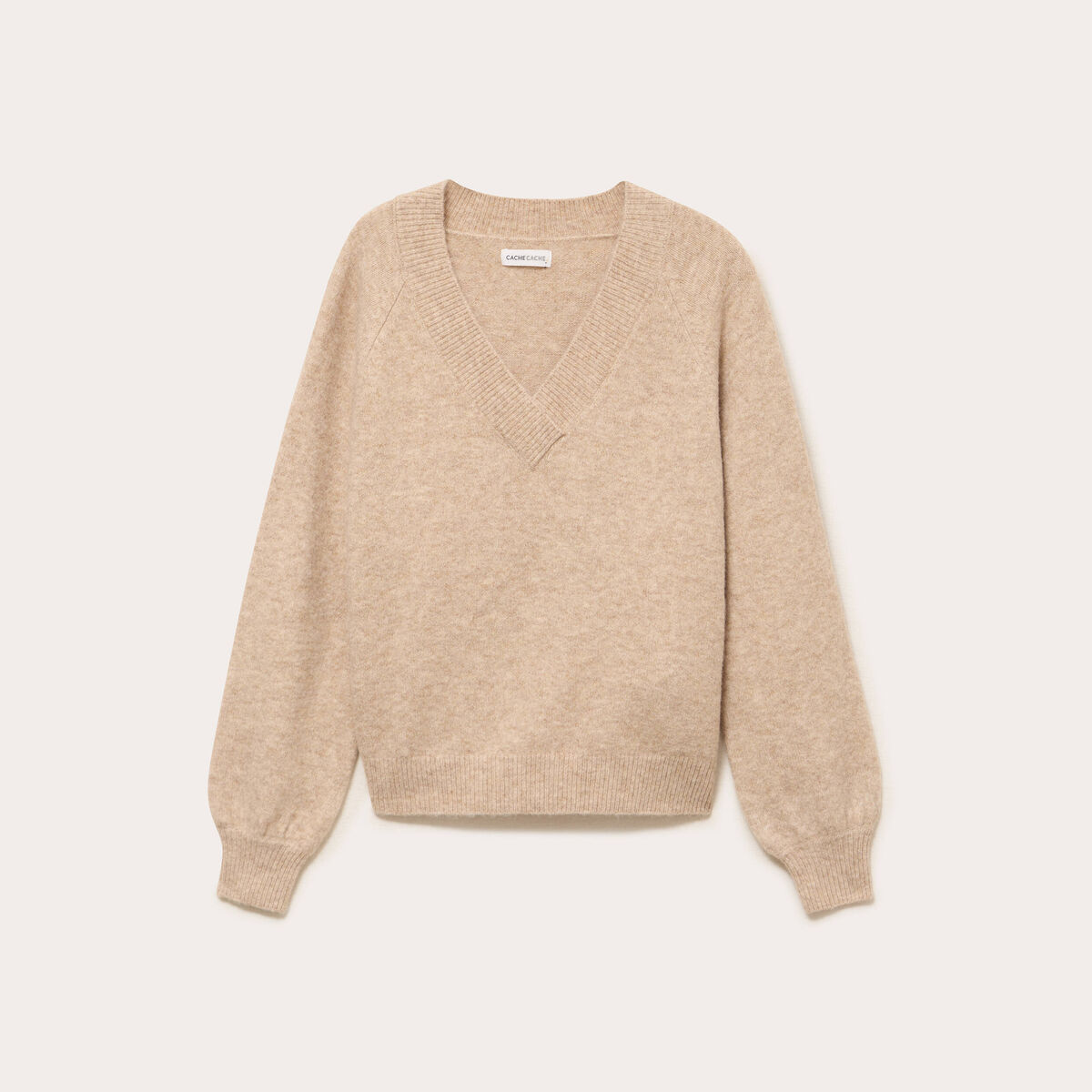 Pull col v manches longues beige femme